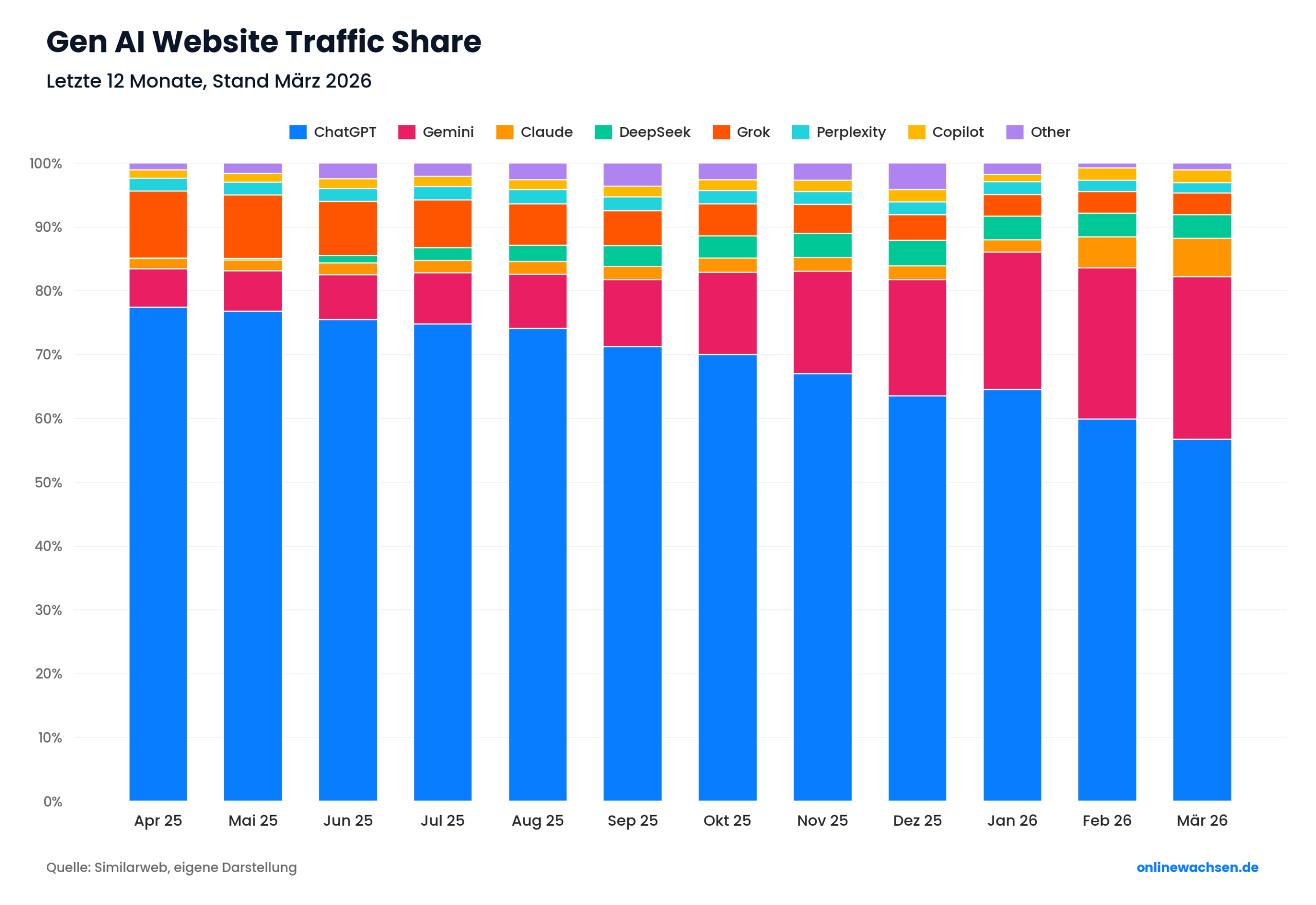 Basierend auf aktuellen Marktdaten von Similarweb, Statcounter, SE Ranking und Menlo Ventures aus dem ersten Quartal 2026.